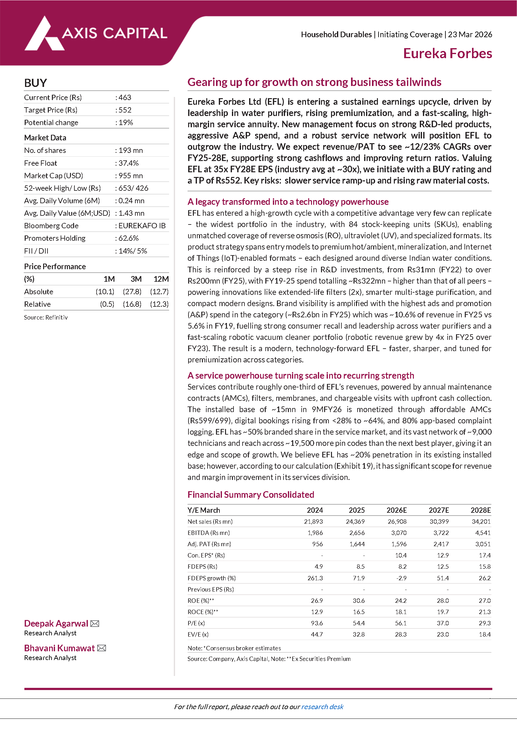 Initiating Coverage: Gearing up for growth on strong business tailwinds...Eureka Forbes Ltd (EFL) is entering a sustained earnings upc...
