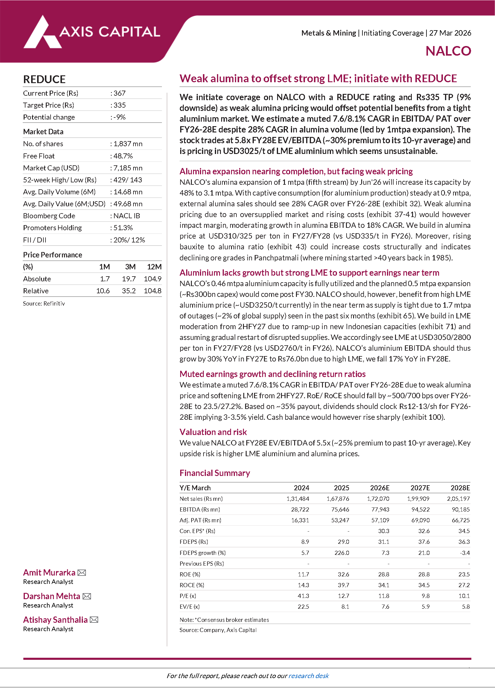 Initiating Coverage: Weak alumina to offset strong LME; initiate with REDUCE...We initiate coverage on NALCO with a REDUCE rating and Rs335...